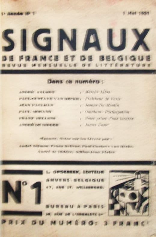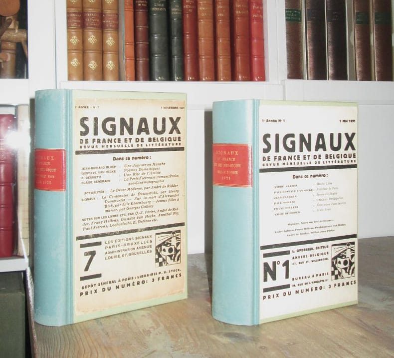 Anvers, N° 1, 1er mai 1921 au n° 11/12, mars-juin 1922. Opdebeek, Éditeur, puis Paris-Bruxelles, Les Éditions Signaux, Directeur (Belgique) : Franz Hellens, Directeur (France) : André Salmon. Comité de rédaction : André de Ridder, Franz Hellens, André Salmon, Paul-Gustave Van Hecke. Collection complète. 12 numéros en 11 livraisons en 2 vol. in-8 reliés. Le n° 2 est en double. 11 fasc. (672 p.) Textes de Blaise Cendrars, Léon Chenoy, Jean Cocteau, André Derain, Fernand Divoire, Neel Doff, Mélot du Dy, Elie Ehrenbourg, Paul Fierens, Georges Gabory, Franz Hellens, Henri Hertz, Max Jacob, Marcel Lecomte, Pierre Mac Orlan, André Malraux, Maurice Martin du Gard, Paul Morand, Jean Paulhan, Odilon-Jean Périer, Pascal Pia, André de Ridder, André Salmon, Marcel Sauvage, Paul-Gustave Van Hecke.. On joint : Une Lettre dactylographiée signée. (9 juin 1964) de la Bibliothèque Royale de Belgique (juin 1964) informant A. Vasseur que leur collection de Signaux de France et de Belgique comporte également 12 numéros. Ensemble très frais, bel exemplaire. Rare.