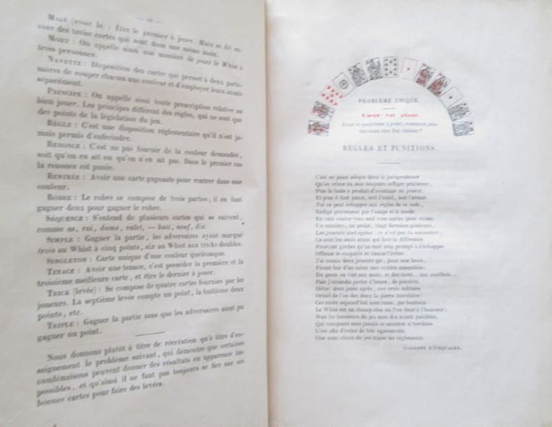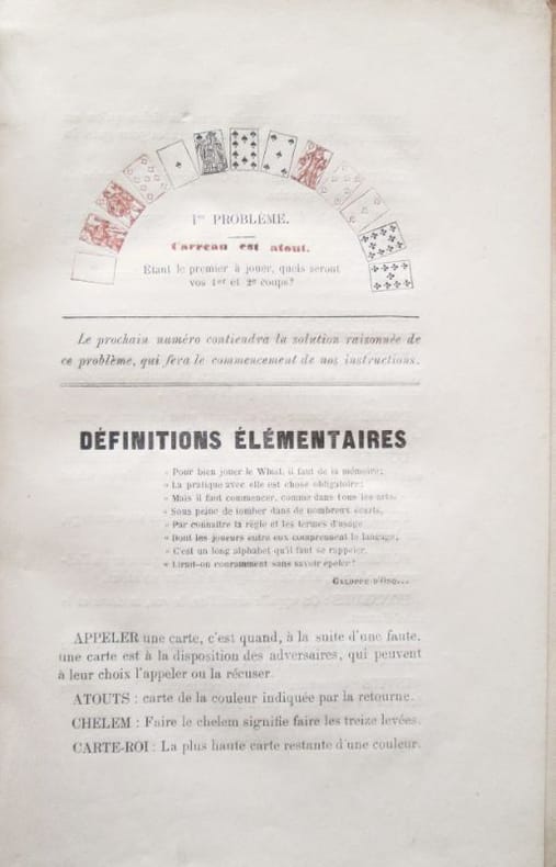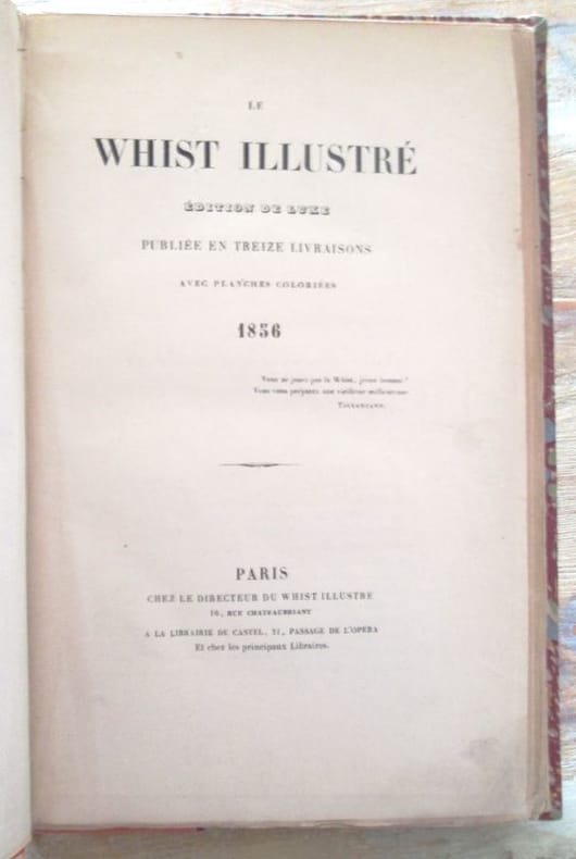 Paris, Gérant : Castel, Directeur-Rédacteur en chef : J. Bourgeois. Du n° 1 au n° 13, 1856. 13 numéros en 13 livraisons en 1 volume in-8 relié demi-percaline corail, titre doré sur pièce de titre noire. . Ex-libris : « Fred. des Moutis ». Textes de J. Bourgeois, Le Camus, Méry, Gallope dOnquaire.Joint : Une coupure du Monde illustré (31 octobre 1863) avec larticle : « De la mort dun Pair dAngleterre dans ses rapports avec le jeu de whist. » Chaque livraison, sous un jeu de cartes coloriées, donne un problème de whist et des anecdotes sur le jeu. Très bon état, fort rare.