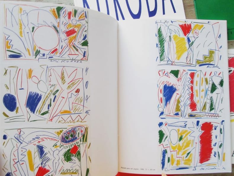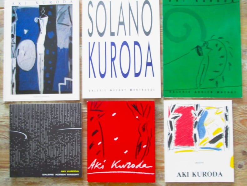 Galerie Adrien Maeght, 1980-1989.Réunion de six catalogues autour d'Aki Kuroda, couvertures en couleurs, non paginés (environ 30 p. chacun), "Aki Kuroda : Ténèbres" par Marguerite Duras, 1980, troisième catalogue Maeght - "Aki Kuroda : ContiNUITé" par Marcelin Pleynet, 1982, dixième catalogue Maeght - "Aki Kuroda : Dessins" par Catherine Francblin, 1984, vingtième catalogue - "Aki Kuroda : Rencontre" par Pascal Bonafoux, 1986, trente-huitième catalogue - "Susana Solano-Aki Kuroda", 1987, cinquante et unième catalogue - "Aki Kuroda", intro de Philippe Lacoue-Labarthe, 1989, soixantième catalogue Maeght. Tous les catalogues sont illustrés en noir et en couleurs. Très bel état.