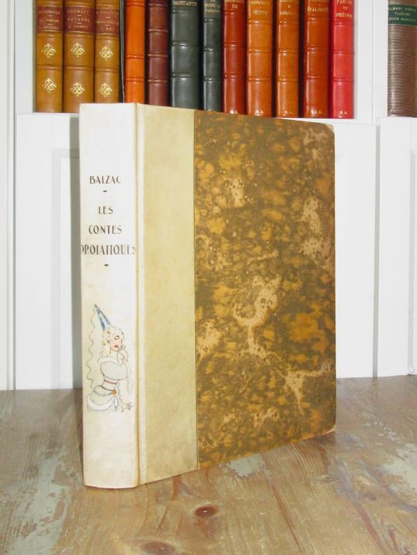 Paris, Gibert Jeune, Librairie d’Amateurs 1940, 265x210mm, 368pages, reliure demi-chagrin à coins bleue avec titre et auteur dorés au dos à trois nerfs. Tranche supérieure dorée. Plat et garde papier marbré. Couvertures conservées. Avec signet. Très belle reliure signée Flammarion.Très bel exemplaire sur papier vélin des papeteries de Navarre, numéroté 2283 / 3000. Cette édition est illustrée de cent vingt-quatre dessins en couoleurs de Dubout. Mise en pages par Louis Malexis, imprimée sur les presses du maître imprimeur J. Dumoulin, H. Barthélemy étant directeur. La gravure des clichés a été effectuée par la Maison Peignot. Les coloris ont été exécutés sous la direction de l’artiste E. Charpentier.