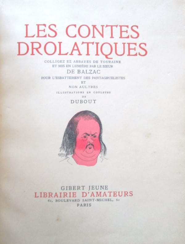 Paris, Gibert Jeune, impr. Maître-Imprimeur J. Dumoulin, à Paris, coll. « Libraire d’Amateurs » 1941 In-4. Broché, couverture rempliée, 368 pp., 124 compositions en couleurs dans et hors texte de Dubout. Dos fragilisé,avec manques en tête et en pied, sinon bon exemplaire.
