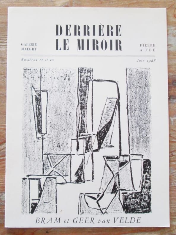 Galerie Maeght, Paris : Éditions Pierre à feu: Derrière Le Miroir n°11, deuxième édition - Derrière le Miroir accompagnant l'exposition Bram VAN VELDE à la Galerie Maeght en 1948, au format 38 x 27,5 cm. 2 lithographies originales en noir de Geer van Velde. 16 reproductions en noir et blanc de Geer van Velde et Bram van Velde. Textes de Samuel Beckett "Peintres de l'empêchement" et de Jacques Kober. Propos de Bram van Velde " Paroles". Exposition de 21 peintures récentes des artistes. Très bon état