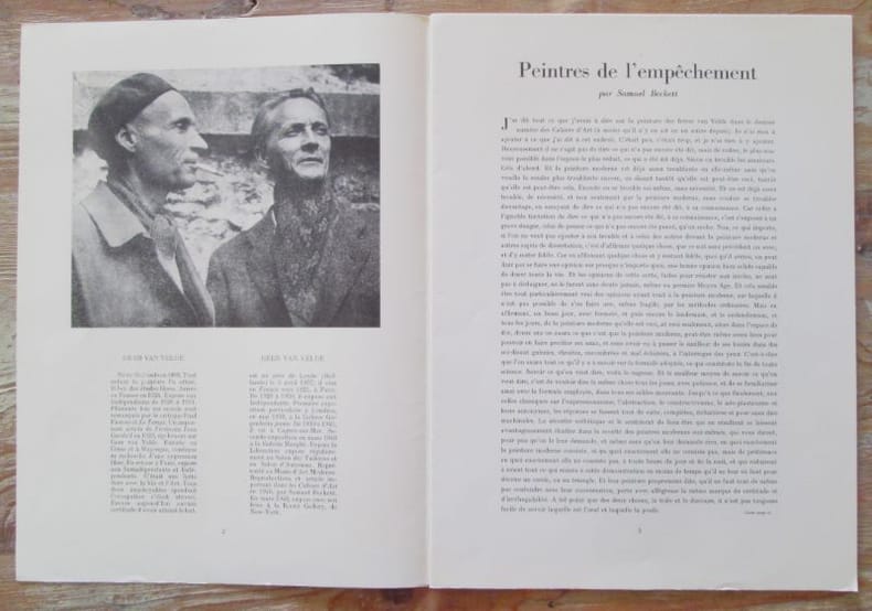 Paris, Maeght éditeur, 1948. In-folio (380 x 280 mm) en feuilles, 8 pages. 2 lithographies originales en noir de Geer van Velde. 16 reproductions en noir et blanc de Geer van Velde et Bram van Velde. Textes de Samuel Beckett "Peintres de l'empêchement" et de Jacques Kober. Propos de Bram van Veldes " Paroles". Exposition de 21 peintures récentes des artistes.