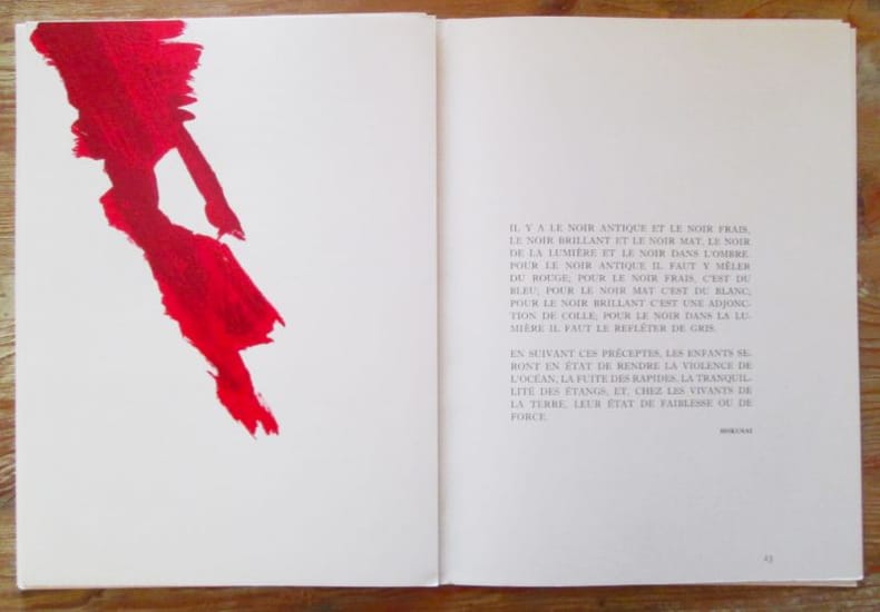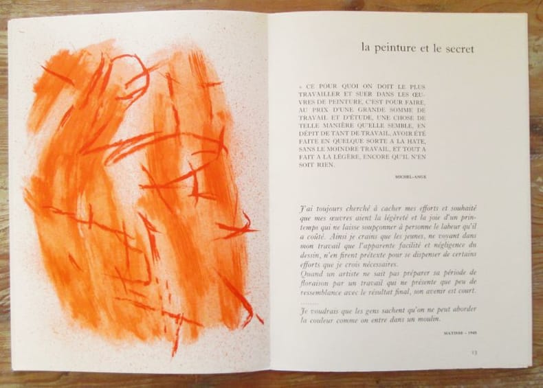 Paris, Maeght éditeur, 1975. In-folio (380 x 280 mm) en feuilles, 32 pages. 7 LITHOGRAPHIES ORIGINALES EN COULEURS. 2 reproductions en couleurs et 12 en noir. Texte composé de fragments textes et de citations de peintres. Exposition de 14 peintures. TIRAGE ORIGINAL. First edition, first printing.