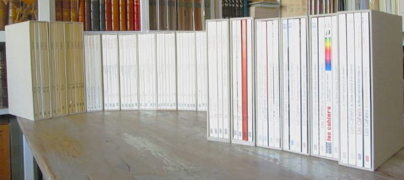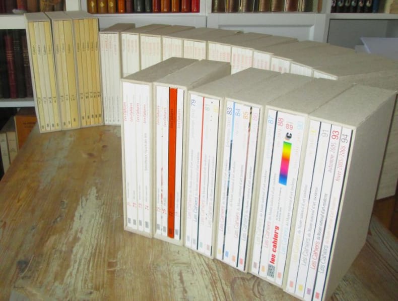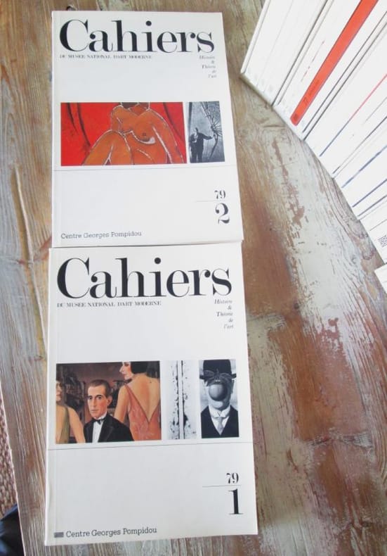 Centre Georges Pompidou, 1979-2006. Tête de série de la Revue : Du n° 1 au n° 94, in-4 brochés insérés par quatre ou cinq dans des étuis cartonnés recouverts de toile écrue. Quatre-vingt-quatorze numéros au format 30 x 31 cm, puis 26 x 18 cm , couvertures illustrées en noir & blanc, 120 et 180 pages par volume, illustrations en noir & blanc. Les Cahiers du Musée national d'art moderne est une revue scientifique éditée par les éditions du Centre Pompidou. Fondée en 1979, cette revue d'histoire de l'art est trimestrielle.- Cette revue donne à lire en français le meilleur de ce qui s'élabore dans le domaine de l'histoire et de la théorie de l'art moderne et contemporain. On peut citer Aby Warburg Amalia Mattaor Anne Malherbe Anri Sala Architecture Arnauld Pierre Arte Povera Beuys Boltanski Brancusi Catherine de Smet Centre Pompidou Chiara Di Stefano Christian Briend Christian Marclay Clement Greenberg Cézanne Dada Dali Daniel Buren Daniel Soutif Delaunay Design Design graphique Didier Ottinger Didier Semin Duchamp Edward Ruscha Erro Erwin Panofsky François-Marie Banier Frédéric Paul Georges Didi-Huberman Gerhard Richter Gilles A. Tiberghien Guggenheim Hubert Damisch Jean-Claude Lebensztejn Jean-Luc Moulène Jean-Pierre Criqui Jean Dubuffet Juliette Bessette Kandinsky Kurt Schwitters Le Corbusier Louise Bourgeois Luciano Fabro Léonard de Vinci Malevich Maria Stavrinaki Marie Gispert Marion Grébert Matisse Max Beckmann Meyer Schapiro Michael Snow Michel Gauthier Miro Mondrian Morellet Muriel Pic Natasha Milovzorova Nicolas Liucci-Goutnikov Olivier Cinqualbre Otto Dix Patricia Falguières Pauline Mari Penone Peter Szendy Philippe-Alain Michaud Philippe Rahm Photographie Picabia Picasso Pierre Huyghe Pontus Hulten Robert Morris Robert Rauschenberg Robert Smithson Roy Lichtenstein Sculpture Sigfried Giedion Sophie Duplaix Stanley Cavell Surréalisme Tatline Thierry Davila Thomas Hirschhorn Tinguely Walter Benjamin Wim Delvoye WordPress Xavier Veilhan Yve-Alain Bois Yves Klein etc. Très bel ensemble sous étuis de relieur, complet du 1 au 94, la plupart de ces premiers numéros étant épuisés.