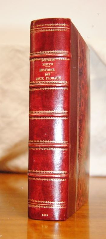 Toulouse, Chez M.-J. Dalles, 1815. 2 tomes en un volume in-8 relié demi chagrin rouge, dos à nerfs souligné de roulettes dorées (reliure du 20ème siècle); Les couvertures du brochage dattente ont été conservées ; exemplaire seulement rogné en tête ; portrait en pied de Clémence Isaure en frontispice-8 pp.-de la page numérotée 5 (sic) à 180-6 pp. (table des matières, errata) et p. de fx-titre-452 pp.-8 pp. (table des mainteneurs, errata). Restauration de la page de faux-titre, bon état par ailleurs.