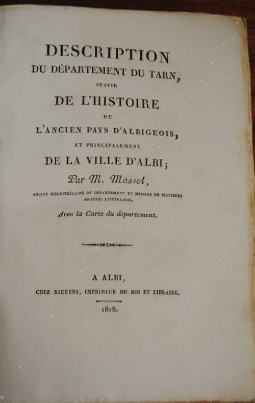 Albi, Chez Baurens, 1818. In-8 reliure à la Bradel couvrure de papier vert, XVI (avec inversion de 2 pp.)- 496 pp.-une carte. Imprimé sur papier épais, non rogné. Rousseurs sur la carte. Petits manques de papier aux mors de la couvrure.