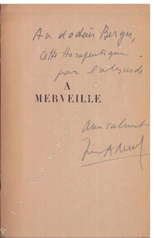 Edition originale, exemplaire "A" nominatif à Gaston Massat, l'un des 5 de A à E sur Johannot, pur fil d'Annonay (plus 80 numérotés de 1 à 80), seul grand papier du tirage de tête. Envoi autographe signé "A Gaston, ce livre qu'il m'a fait pousser dans la tête, comme un arbre qui se devine "A Merveille" dans mes yeux, le même arbre dans les siens, et le fruit défendu pour tous. Affectueusement. Janot".Gaston Massat (Saint-Girons 1909-1966), poète surréaliste, a fait connaître André Breton à Jean Marcenac et Joë Bousquet ; tous furent Résistants pendant l'Occupation ; Massat a longtemps été libraire à Saint-Girons.A merveille, oeuvre du poète communiste Jean Marcenac, est composée de sept contes. Le surréalisme inspiré de l'auteur y exprime à la fois des sentiments liés à la guerre et des aspirations à une autre vie humaine ou à d'autres mondes. Ainsi, la poésie, le rêve ou l'imagination côtoient l'étrangeté, la fable ou l'utopie, dans des récits comparables aux tableaux de Jérôme Bosch, le tout dans une écriture claire, concise et généreuse (L.P.). La reliure, non signée, est très probablement l'oeuvre de Gaston Massat, peut-être inspirée par le bestiaire de Jean Lurçat, qui était un ami.