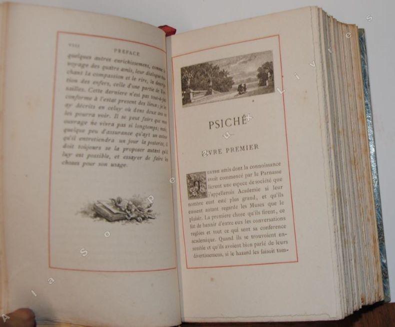 L'ouvrage s'agrémente de jolies illustrations du temps. ''Permanente matière de rêve humain sur le symbolisme des amants liés par des tabous, enchaînés à d'obscures puissances, sur les risques et les sortilèges de l'amour, sur les secrets de la nuit, sur la part d'inconnu et de songe à inclure dans toute relation passionnelle''. (Jean Rousset). ''Chef d'oeuvre de l'art baroque, ce récit perpétue d'audace et de liberté délicieuses avec ses jeux de miroirs, l'antique fable du dieu épris d'une mortelle. Du mythe, de décor au sein duquel évolue Polyphile et ses amis, naissent incessamment des tableaux. De la grotte magique de Thétis aux voluptueux jets d'eaux, ''où l'onde sert de flambeaux'', nous sommes conviés à pénétrer aux côtés de Psyché dans le Palais de l'Amour, par la galerie d'un jardin dépouillé des vestiges d'une fête, celui des infortunes de Psyché exilée de son paradis. Transportée dans le Palais de Cupidon, là, servie par des nymphes soumises, elle connaîtra l'amour dans les bras du dieu toujours enveloppé de ténèbres, et qui lui interdit de tenter voir ses traits... Après bien des péripéties, la jeune Psyché futile qui se contentait de se laisser adorer au début du récit est devenue une amante en souffrance, qui connaît à présent le prix de la possession et qui sait à présent que l'amour s'exalte dans l'absence, et que les biens invisibles surpassent l'illusion des apparences. Si l'on retrouve au travers de ce texte la trace du mythe platonicien de l'âme en quête de divin, il s'agit également ici de la description d'un voyage initiatique doublé d'un rite amoureux.'' (in Pia). Pia, Dictionnaire des oeuvres érotiques, p. 21. Plats présentant un éclat très légèrement altéré. Tâches au dos. Du reste, bonne condition. Exemplaire en partie non coupé.