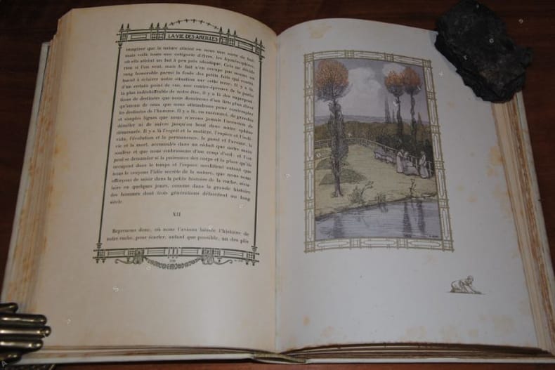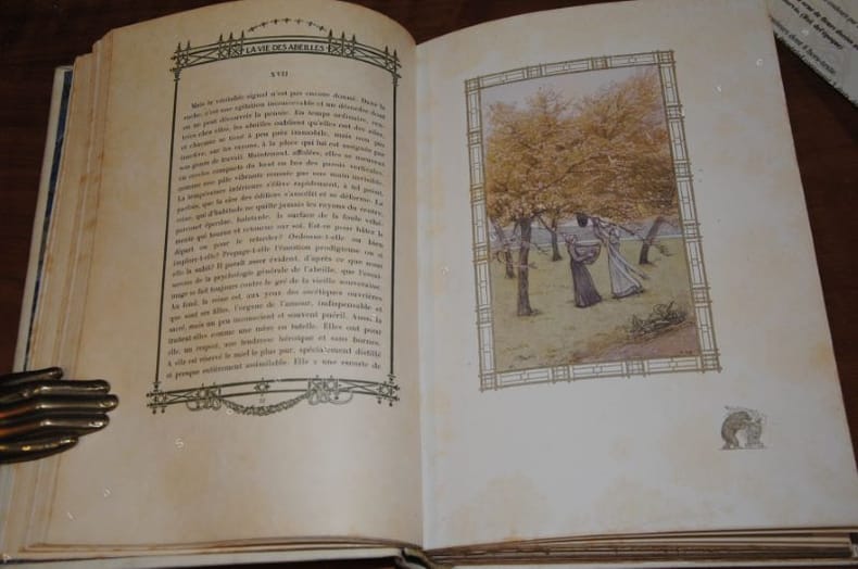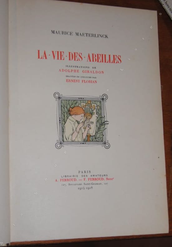 Paris, Ferroud 1914-1918. Petit in-4 plein vélin orné de fleurs dorées aux angles et d'une abeille au centre, tête dorée, couverture et dos conservés. (Rel. del'époque). 32 compositions gravées sur bois en couleurs dont 8 hors-texte. 1/30 premiers exemplaires sur grand Japon impérial contenant 3 états des bois, la décomposition des couleurs d'une planche et une aquarelle originale inédite d'Adolphe Giraldon. Rousseurs sur les tranches, sinon superbe exemplaire.
