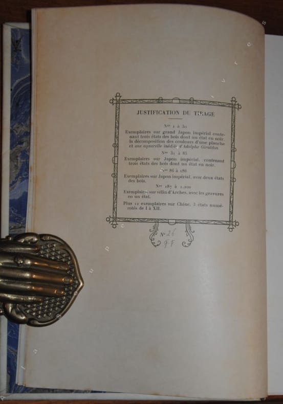 Cette «édition recherchée et cotée » (Carteret) est illustrée de 32 compositions de Giraldon gravées sur bois en couleurs, 8 hors texte dont un frontispice, 8 têtes de chapitre illustrées, 7 en-têtes, 7 culs de lampes, 1 vignette de couverture et 1 vignette de titre. Un des 67 exemplaires sur Japon impérial, contenant trois états des bois dont un état en noir.