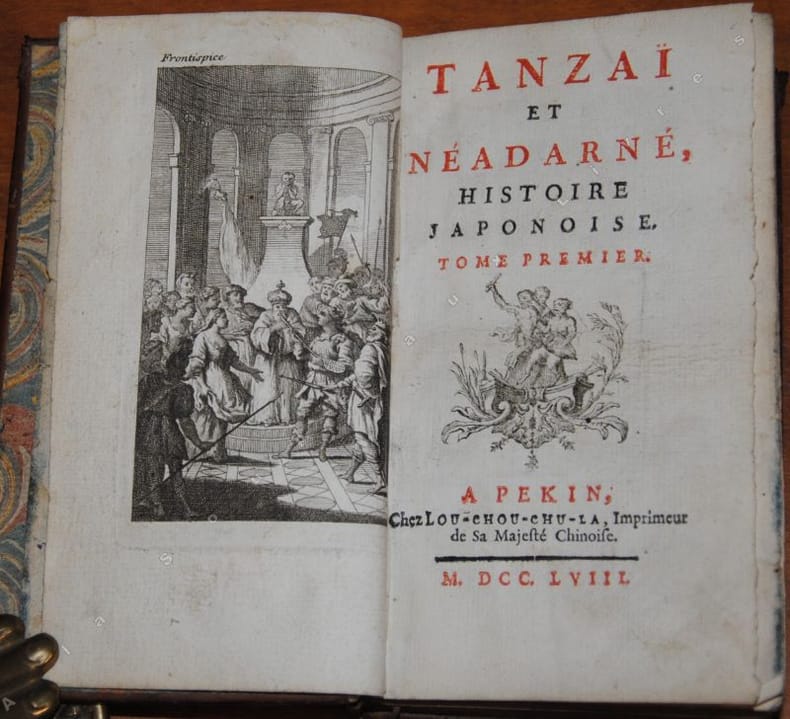 A Pékin, chez Lou-chou-chu-la, 1758. in-16 reliure pleine peau d'époue, dos long orné, p. de t. et de t., frontispice-xix-5 pp.-275 pp. coiffes arasées, coins arondis, menus défauts