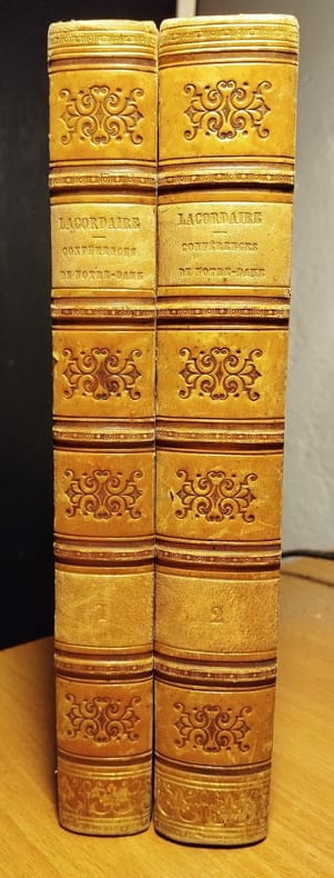 Paris, Poussielgue 1877 complet en 5 vols.: 400 + 384 + 476 + 398 + 438pp., 18cm., dans la série "Oeuvres de R.P. Henri-Dominique Lacordaire" tomes 1-5, reliures demi-toile (plats marbrés), qqs.rousseurs, bon état, [titre complet du 5e tome: Conférences de Notre-Dame de Paris et conférences de Toulouse. Années 1851, 1854], R70428