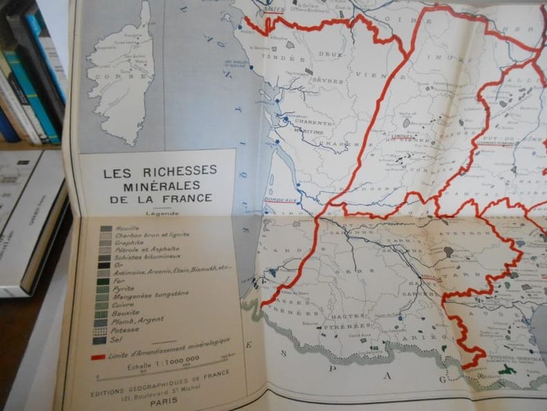 1930 Mémoires pour servir à l'explication de la carte géologique détaillée de la France.LES BAUXITES DE LA FRANCE MERIDONALE.Imprimerie nationale, 1930 , grand in4°(25x33) broché,186pp.9 planches de photos avec texte explicatif en regard,50 figures dans le texte . Joint une carte des "Richesses minérales de la France " de 100 x 120 cm éditée par les Editions géographiques de France ,sd.Très bon état.Couverture légèrement défraichie.