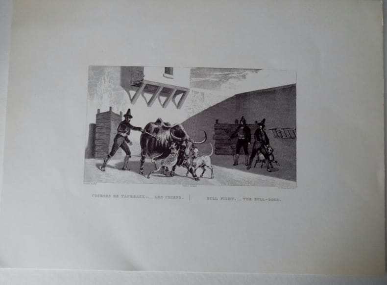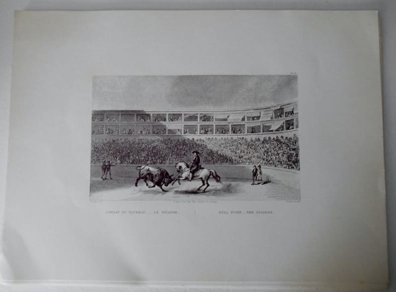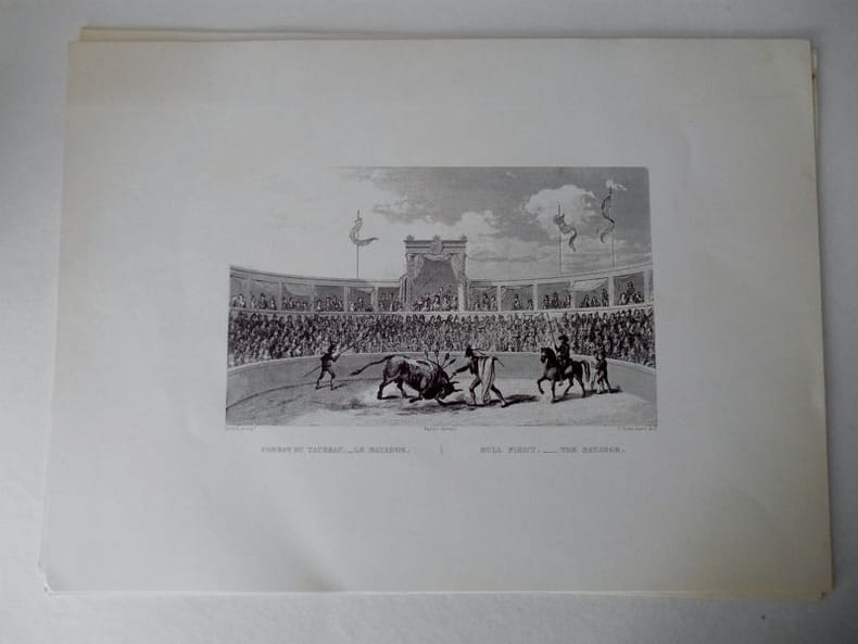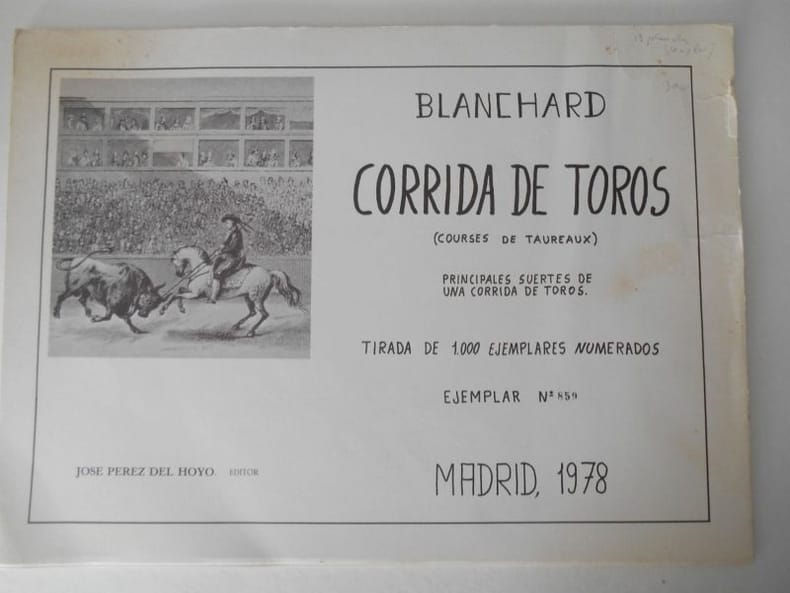 1978 Corrida de toros. (course de taureaux). principales suertes de una corrida de toros..Madrid ,J Perez del Hoyo 1978,in plano à l'italienne (43x31). En feuilles , 13 planches lithos(complet ) et la couvertureTiré à 1000 exemplaires numérotés.Reédition en fac similé de cet ouvrage rarissime.Couverture défraichie sur les bords ,planches en parfait état.