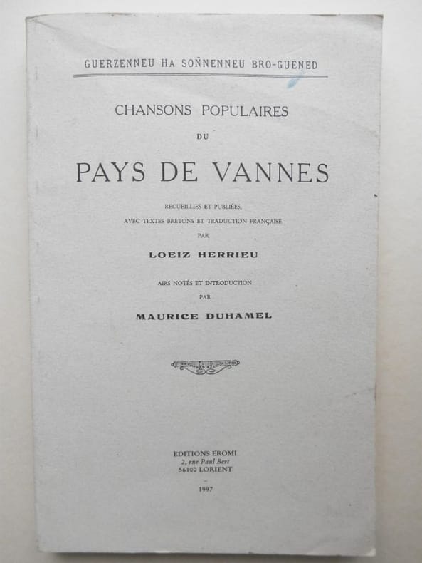 1997 CHANSONS POPULAIRES DU PAYS DE VANNES . Recueillies et publiées avec textes bretons et traduction française par Loeiz Herrieu avec notes et introduction par maurice Duhamel.Lorient, Eromi 1997, in8 broché , 185 pp.Reproduction à l' identique de l' édition de 1930.Une petite tache d'encre sur la couverture, premières pages écornées. Très bon état général.