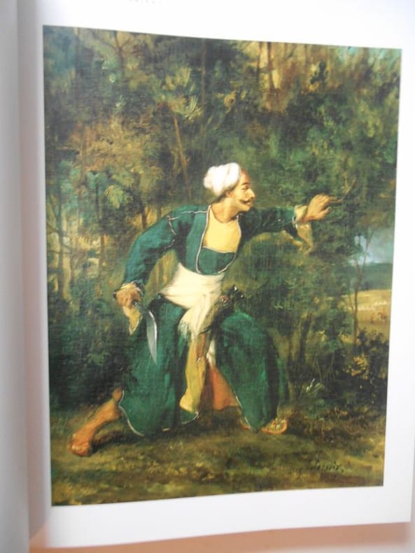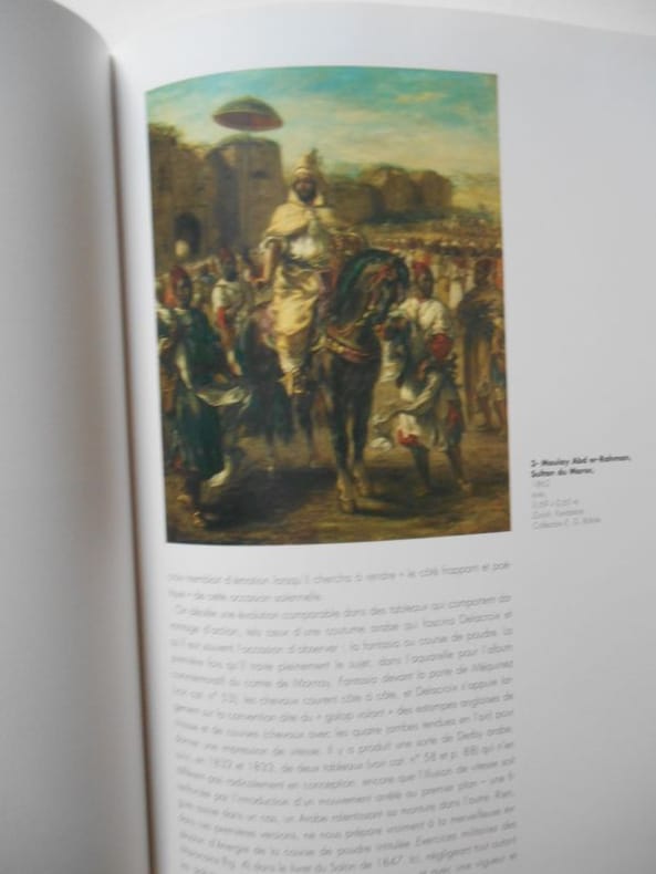 Somptueux catalogue de l’exposition présentée à l’Institut du Monde Arabe, du 27 septembre 1994 au 15 janvier 1995, précédé de deux prologues, par Edmonde Charles-Roux et Tahar Ben Jelloun. Suivent, quatre textes, illustrés de 74 planches ou vignettes et d’une carte : « Delacroix et l’Orient », par Maurice SERULLAZ, « Le voyage », par Maurice ARAMA, « L’influence du Voyage sur l’art de Delacroix », par Lee JOHNSON, et, par Arlette SERULLAZ : « Chronique d’une aventure initiatique » et le « Catalogue » (pp.136-231), illustré de 103 reproductions, la plupart en couleurs. In fine, chronologie, biblio. , expos, glossaire et index. Sur la « toile », quelques descriptions savoureusement affligeantes : « 103 ill. », mieux, « plus de 120 ill. », encore mieux, « plus de 160 ill. » ; la meilleure, comme d’habitude : « Couv. convenable , Dos satisfaisant, Intérieur frais (sic). 238 pages augmentées (re-sic) de nombreuses illustrations en couleur dans et hors texte... », par « ze bouc », membre à part entière d’un Grand Syndicat ... Pour la datation, ce livre, dont l’achevé d’imprimer est de « septembre 1994 », on trouvera néanmoins, 1992 (Deutschland), 1995 et 1999 (en Gaule ).Très bel ouvrage, dans une condition (presque) parfaite. BUR F3
