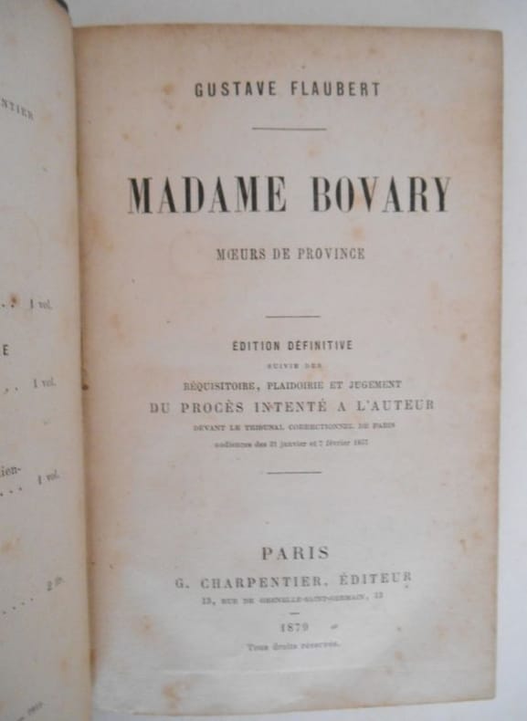 1879 MADAME BOVARY . Moeurs de province .Edition définitive,suivie du réquisitoire , plaidoirie et jugement du procès intenté à l'auteur .P, Charpentier , 1879 , in12 1/2 chagrin bleu nuit, 470pp .Petit manque à la coiffe supérieure.