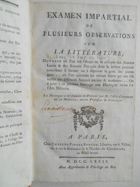 1779 EXAMEN IMPARTIAL DE PLUSIEURS OBSERVATIONS SUR LA LITTERATURE.La harangue a été traduite en français par M l' Abbé Creyssent...Paris, Charles Pierre Berton , 1779 , in8 relié, couverture papier , XXXI-530ppCoiffe supérieure émoussée. Très bon état intérieur.