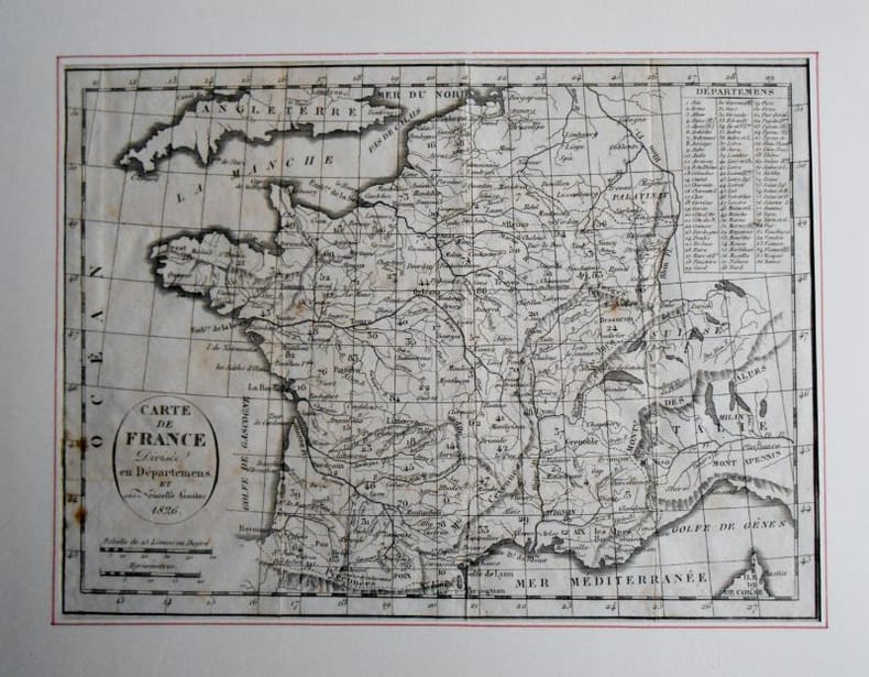 Carte de france divisée en départements ses nouvelles limites .Carte de 26 x 22 cm.Carte des 86 départements.