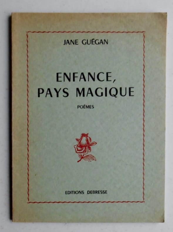 Debresse Broché "In-12 (14 x 19 cm), broché, 46 pages, sans date, bel envoi de l'auteur ""Pour Simone et [?], en souvenir des belles heures passées en leur compagnie près de la forêt de Brocéliance, cette ""Enfance, pays magique"" qu'évoque au pays breton tout un monde ""enchanté, avec ma plus amicale pensée. Jane Guégan, 28 novembre 71"" ; quelques petites rousseurs et traces aux plats, pliure dans le coin supérieur du premier plat, par ailleurs assez bon état général. Livraison a domicile (La Poste) ou en Mondial Relay sur simple demande."