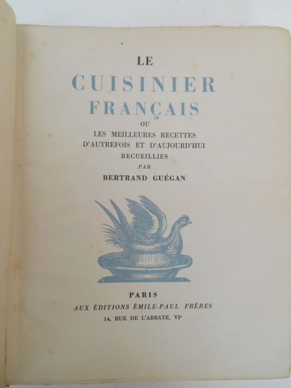 1934 LE CUISINIER FRANCAIS ou les meilleures recettes d' autrefois et d' aujourd ' hui recueillies par Bertrand Guégan.Paris, Emile Paul , 1934 ,in4°(20x24) 1/2 chagrin marron ,653pp . Abondantes illustrations.Un accroc restauré en haut du dos , sinon parfait état.