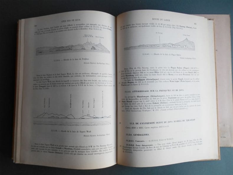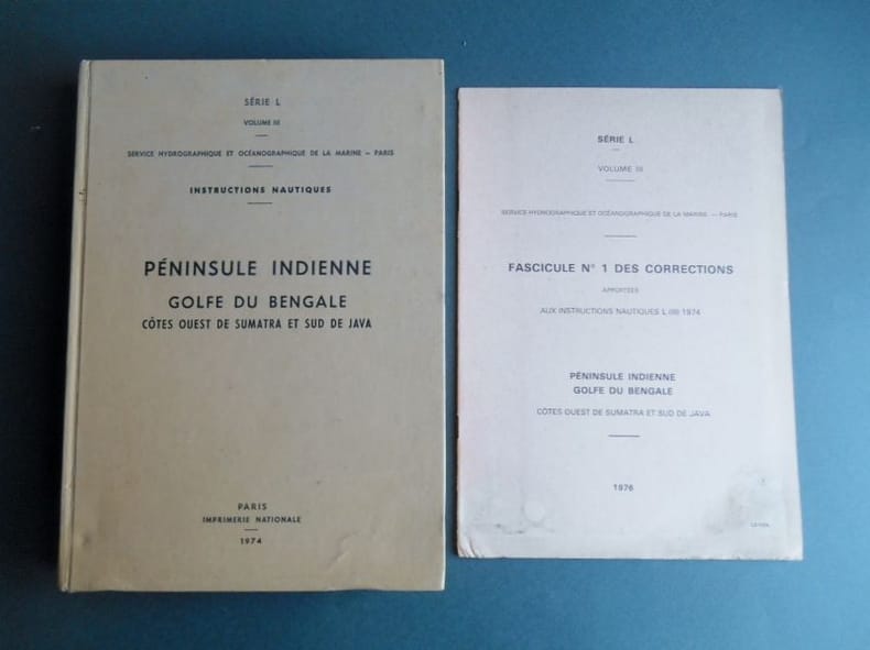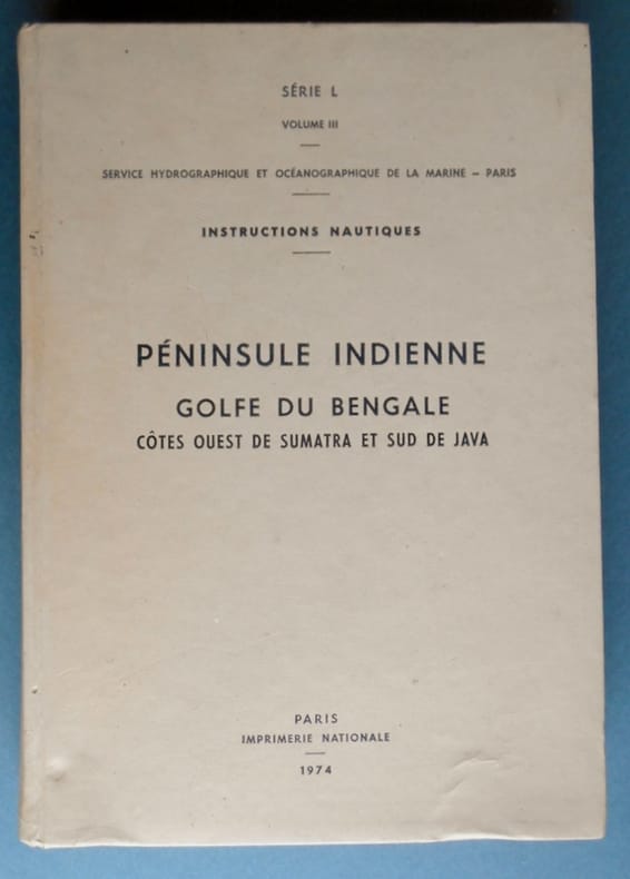 1974 Instructions nautiquesPENINSULE INDIENNE , GOLFE DU BENGALE COTES OUEST DE SUMATRA ET SUD DE JAVASérie L , volume IIIService hydrographique et océanographique de la marine ,Imprimerie nationale , 1974 grand in8 (19x28) reliure crème éditeur ,399 pp - 6 cartes dépliantes hors texte .Joint le fascicule 1 des corrections apportées au présent ouvrage de 12ppTraces de mouillure sur le bas droit du supplément
