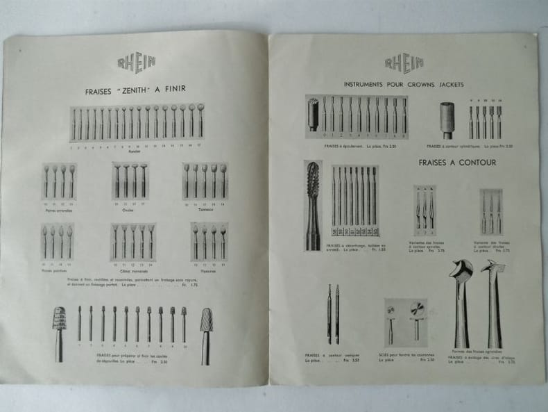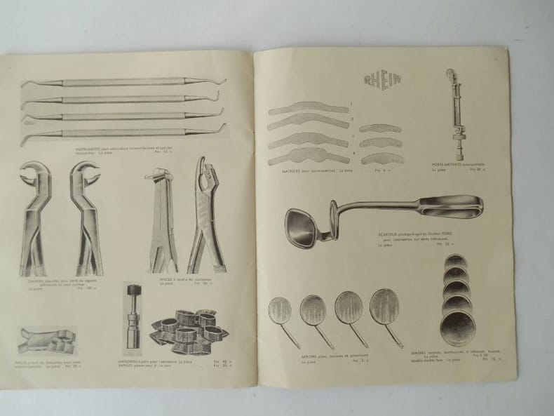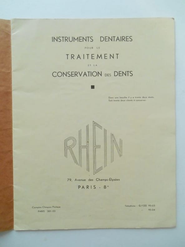 1950 RHEIN . Instruments dentaires pour le traitement et la conservation des dents .Paris , Rhein , v 1950/60 , in4° broché .Catalogue de 24 pages d' instruments .