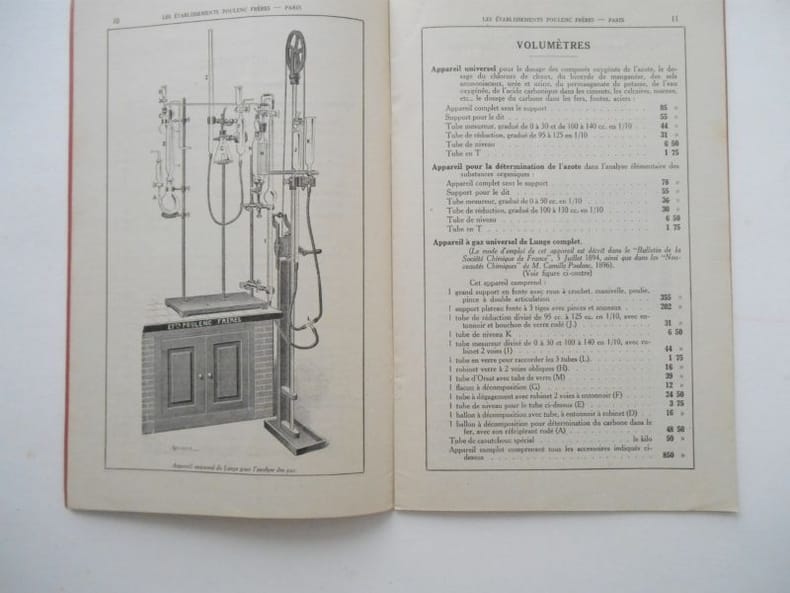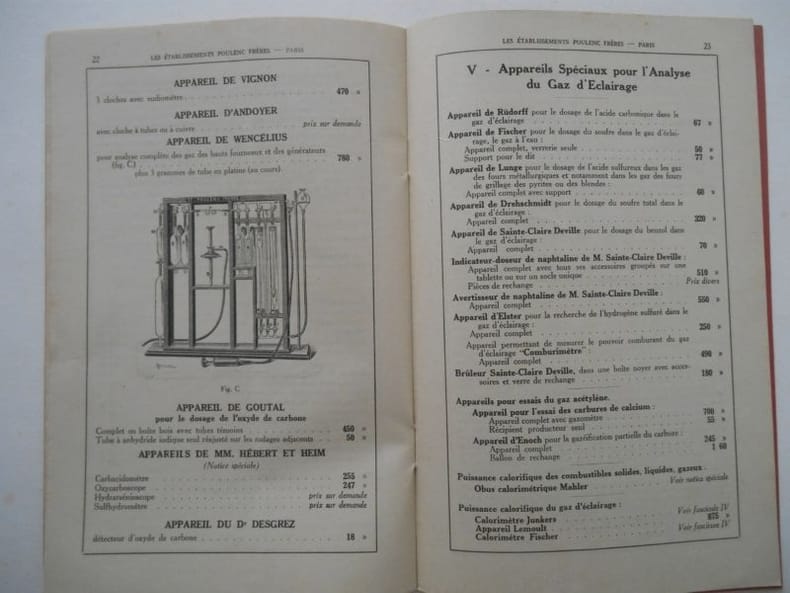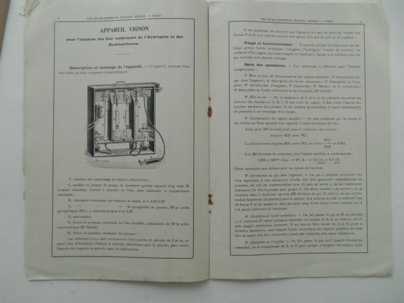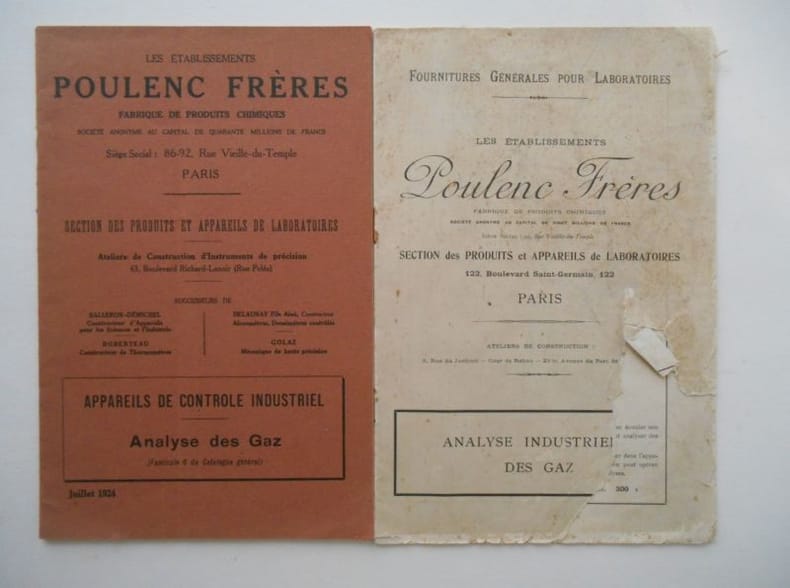 1924 Appareils de contrôle industriel . Analyse des gaz POULENC FRERES , 1924 , 2 fascicules in 8 de 32 et 20 pp.Couverture du 2ème catalogue défraichie avec manque . Sinon très bon état .