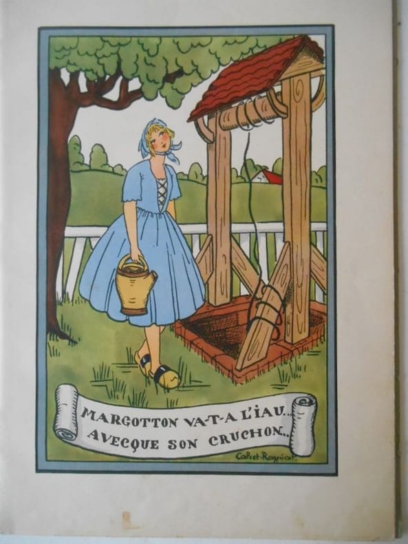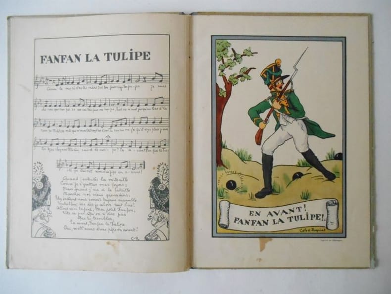 Sans lieu ni date Sans lieu ni date vers 1900. Petit In-4 relié cartonnage éditeur illustré, dos toilé bleu; Chansons avec air noté et illustrations couleurs en regard de Calvet-Rogniat. Coins inférieur abimé, une page se détache.