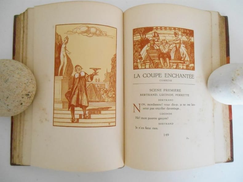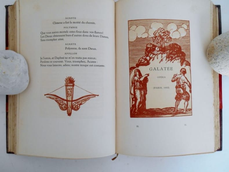 1933 LES AMOURS DE PSYCHE ET DE CUPIDON Edition conforme aux textes originaux , établie par Louis PerceauOrnée de bois en 2 tons gravés par G Aubert .Le Livre du bibliophile - Georges Briffaut , 1933 , 2 vols in8(17x24) 1/2 chagrin rouge à coins, tête dorée , couvertures conservées , 332 - 284 pp .Edition numérotée sur velin de rives (491)Rousseurs . Traces d' humidité avec papier fragilisé sur les premières pages du T 1.Ensemble, néanmoins des plus convenable.