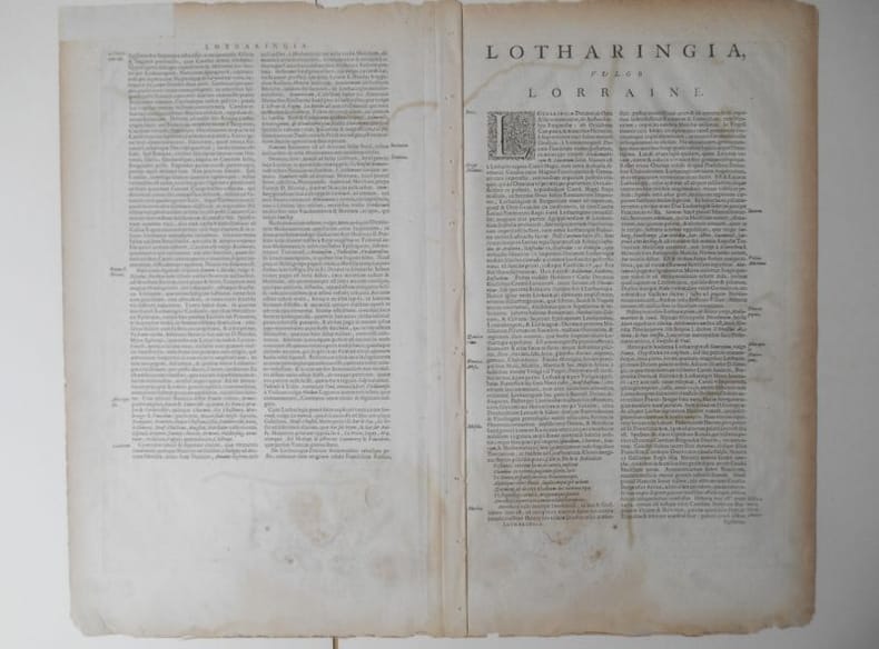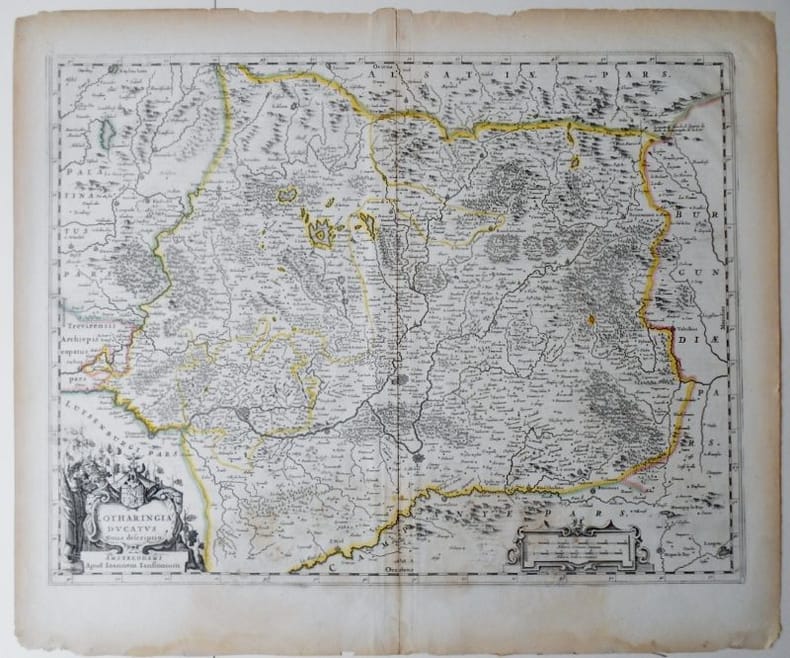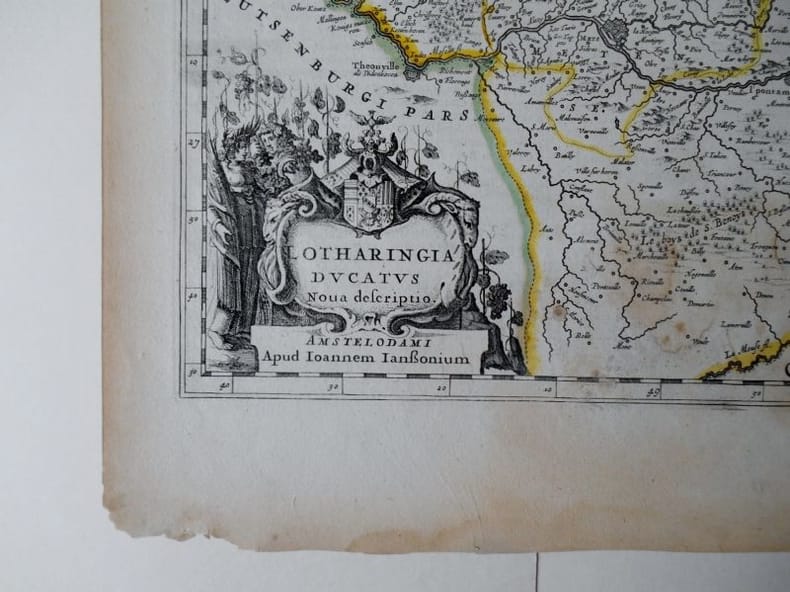Amstelodami , Ioannem Jansonium , sd ( v 1650 ) , carte 55 x 42 cm , contours coloriés . Marges légèrement effrangées. Carte orientée avec le Nord à gauche de la planche .