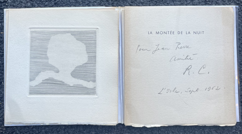 Alès, PAB, 1961. In-16°(135x131mm),en feuilles, couverture blanche imprimée à un rabat. Édition illustrée de 4 gravures de Jesse Reicheck. Tirages à 50 exemplaires sur Arches et 10 sur Japon plus quelques exemplaires réservés aux collaborateurs, celui-ci marqué h.c. 10 sur Arches, justifié et monogrammé par PAB, signé par Reichek. ENVOI DE RENÉ CHAR à un certain Jean-Pierre, daté de septembre 1962.