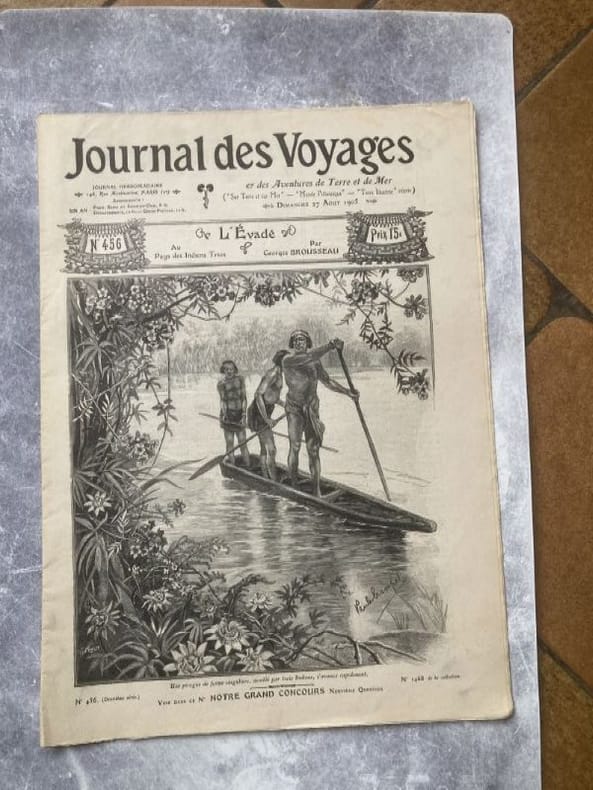 ILLUSTRATION DE LA COUVERTURE - Une pirogue en forme singulière, montée par trois indiens, s'avance rapidement .-envoi possible d'un scan de la couverture
