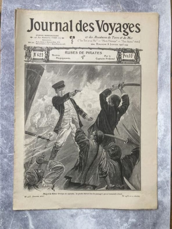 ILLUSTRATION DE LA COUVERTURE par LE CLERC et Vintraut ( malgrés la défense héroîque du capitaine. les pirates tuèrent tous les passagers qui se trouvaient à bord)envoi possible d'un scan de la couverture