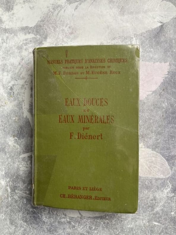 Paris, Librairie polytechnique Baudry & Cie, Éditeurs, 1912 ; in-12 (119 x 179 mm), 4-364 pp. + 3 pl. dépliantes hors-texte, reliure d'éditeur pleine percaline, coloris vert, dos lisse, tranches jaspées. Collection «des Manuels pratiques d'Analyses chimiques à l'usage des Laboratoires officiels et des experts», publiés sous la direction de M. F. Bordas, directeur des Laboratoires du Ministère des Finances et M. Eugène Roux, directeur du service de la répression des fraudes au Ministère de l'Agriculture. Quelques illustrations en noir et blanc.