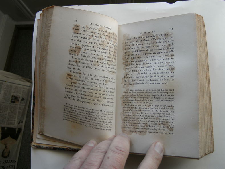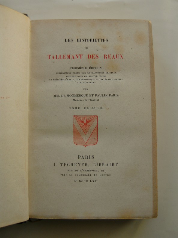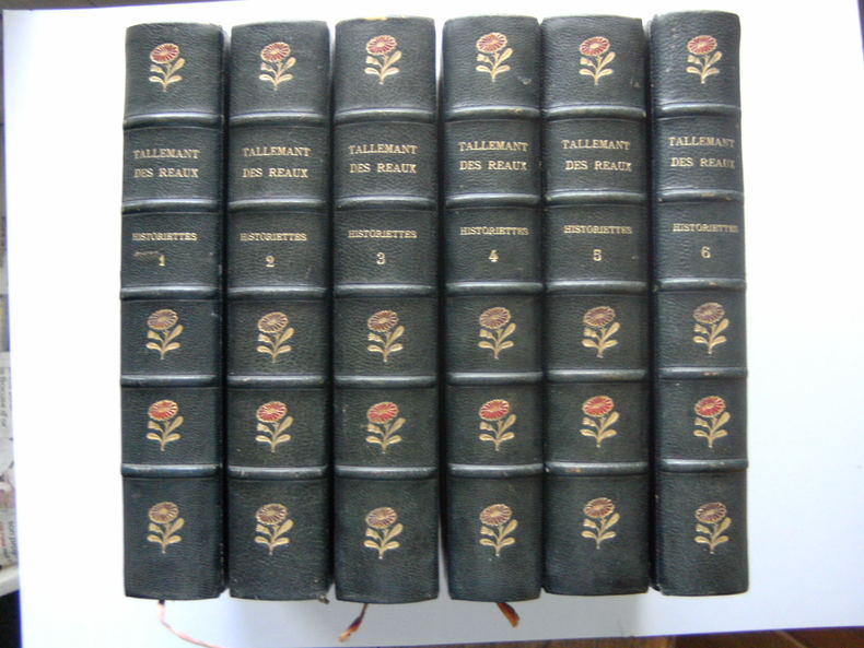 Paris, Techener, 1862. 120 X 185 mm. 6 tomes reliés demi-chagrin bleu nuit, dos à nerfs orné de fleurons mosaïqués, tête dorée, non rogné (rel. post.). Près de 3000 pp. Table générale. Le témoignage de l'auteur sur la société de la première moitié du XVIIe siècle est de toute première valeur; il a de plus le mérite d'être extrêment plaisant (Laffont-Bompiani, Dictionnaire des auteurs). Rousseurs éparses.