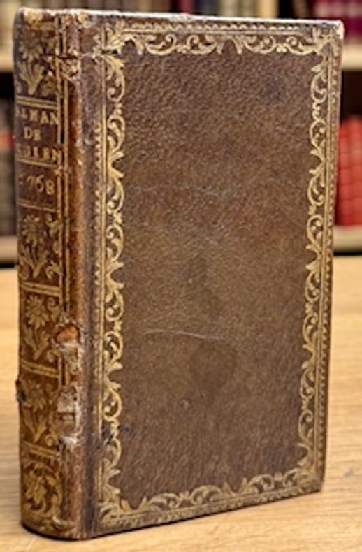 Bordeaux Frères Labottière 1768 1 vol. relié in-32, maroquin havane, dos lisse orné de filets, fleurons et dentelle dorée, frise dorée en encadrement sur les plats, coiffes guillochées, tranches dorées, 287 pp. (reliure d'époque avec quelques infimes manques de cuir au dos). A noter le charmant papier peint à la main en pages de garde.