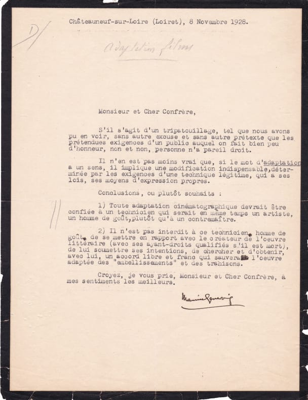 1 page in-4 sur papier deuil, Châteauneuf-sur-Loire, 8 novembre 1928. Lettre adressée à Ali Héritier, en réponse à une enquête réalisée par la revue hebdomadaire Cinémonde. A la question : "Un metteur en scène a-t-iI le droit de modifier l'intrigue d'un roman ou d'une pièce qu'il portera à I'écran ?", le lauréat du Goncourt 1925 répond : "S'il s'agit d'un tripatouillage, tel que nous avons pu en voir sans autres excuses et sans autre prétexte que les prétendues exigences d'un public auquel on fait bien peu d'honneur, non et non, personne n'a pareil droit; Il n'en est pas moins vrai que, si le mot d'adaptation a un sens, il implique une modification indispensable, déterminée par les exigences d'une technique légitime, qui a ses lois, ses moyens d'expression propre"... Les diverses réponses obtenues par l'enquêteur Ali Héritier seront partiellement publiées dans les n° 14 à 16 de Cinémonde, en janvier et début février 1929.