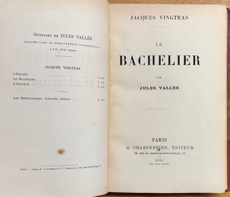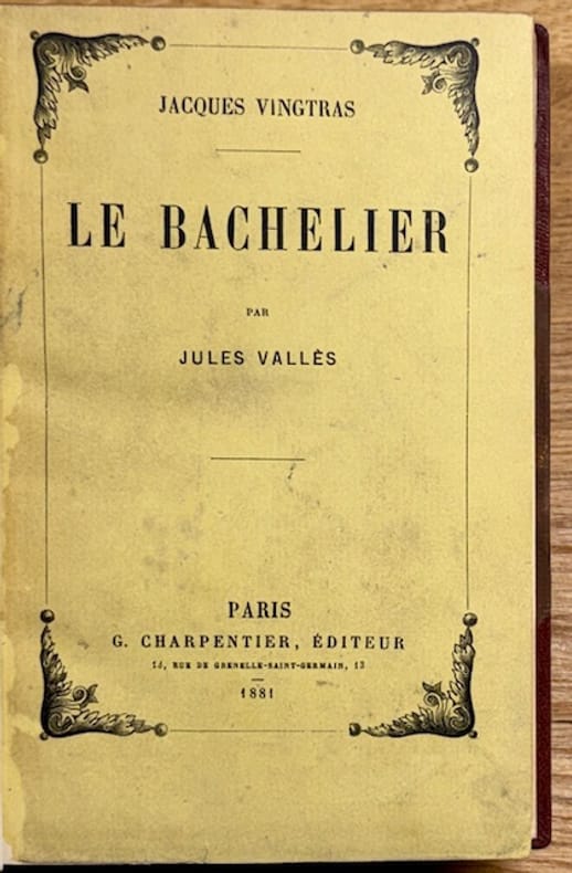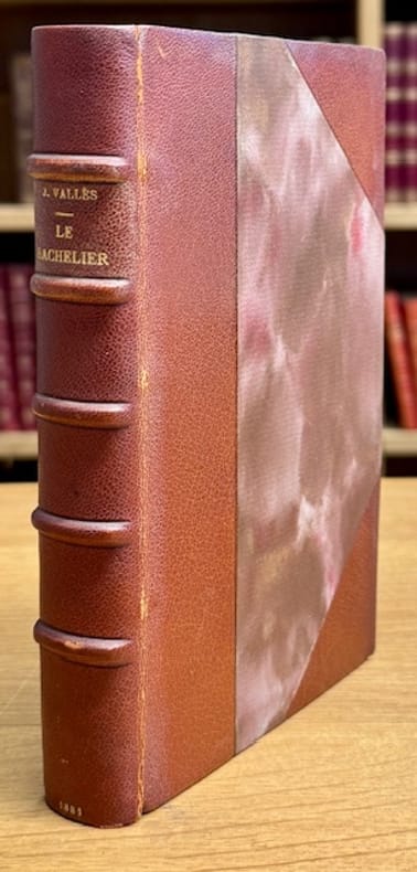 Paris G. Charpentier 1881 1 vol. relié in-12, demi-maroquin brun à coins, dos à nerfs, tête dorée, couvertures conservées, 434 pp. Édition originale du second volume de la trilogie Jacques Vingtras. Ex-libris Maurice Miller (tampon). Rares rousseurs.