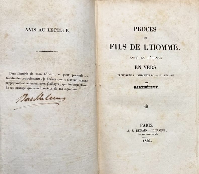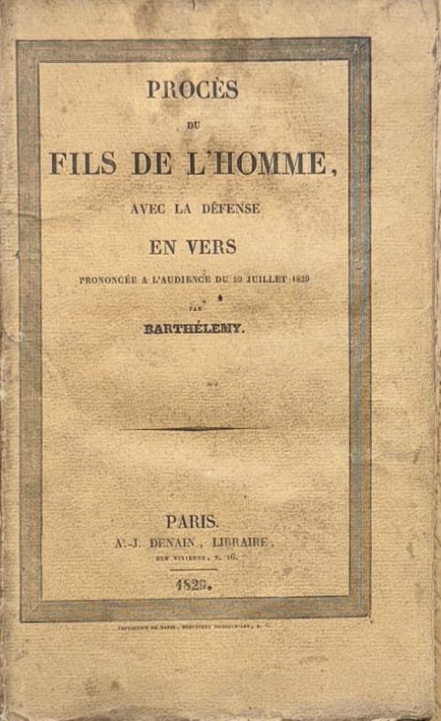 Paris A.-J. Denain 1829 1 vol. broché in-8, broché, 78 pp. (couverture un peu défraîchie). Edition originale de premier tirage avec la signature manuscrite de Barthélemy. Libéraux et voltairiens de formation, A.-M. Barthélemy et J. Néry écrivent à partir de 1828 une trilogie célébrant l'épopée napoléonienne composée de "Napoléon en Egypte", "Le Fils de l'homme" et "Waterloo". Célébrer Bonaparte en pleine Restauration leur vaut d'être emprisonnés et condamnés à des amendes mais le procès prend un tour inhabituel : "Barthélemy, se levant, donna lecture d'une voix ferme et sonore d'un plaidoyer en vers non moins bien frappés que ceux du poème incriminé. Il se défendit habilement d'avoir voulu outrager la famille royale et se justifia du reproche de provocation à la révolte en déclarant que les temps n'étaient plus où un Napoléon pourrait ébranler le pouvoir de Charles X. Le tribunal n'en condamna pas moins Barthélemy à trois mois d'emprisonnement et 1000 francs d'amende, et ordonna la destruction de l'édition" (cf. Garsou, Les créateurs de la légende napoléonienne).