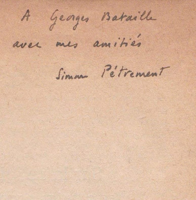 Paris Librairie Armand Colin 1955 1 vol. broché in-8, agrafé, pp. 306-330. Tiré à part de la Revue de métaphysique et de morale, enrichi d'un envoi autographe signé : "A Georges Bataille, avec mes amitiés, Simone Pétrement".