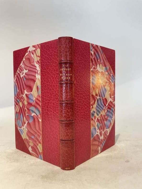 Exemplaire sous étui et chemise cartonnée d'éditeur (260x200mm), chemise souple rempliée et illustrée, 201 pages, 1f table, 1f achevé d'imprimer, 1fbnc. Exemplaire numéroté 283/500 imprimé sur papier pur chiffon du Marais, accompagné de 23 gravures sur cuivre en couleurs de Jean Berque (1867-1920). Originaire du Béarn, l'écrivain français Paul-Jean Toulet publie Mon amie Nane en 1905. Étui bords frottés, ex. en très bon état.