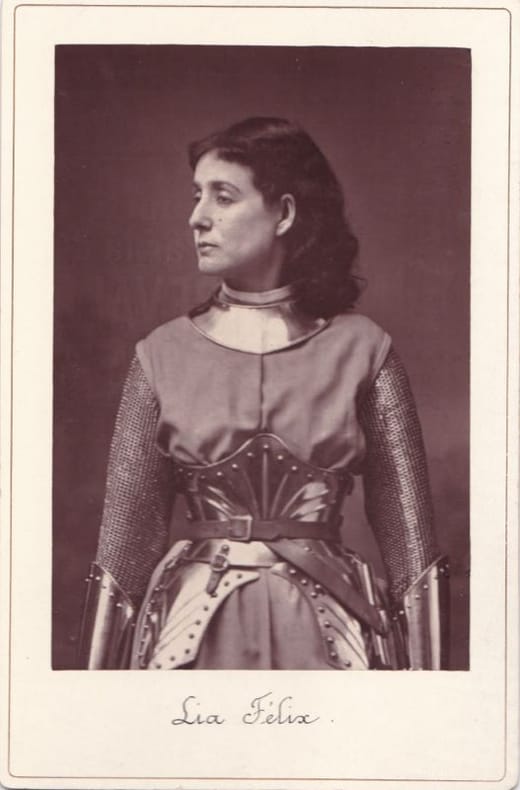 Beau tirage d'époque sur papier albuminé contrecollé sur carton fort avec légende manuscrite en pied "Lia Félix", 13 x 8,6 cm (tirage), vers 1873. Cinquième enfant d'une fratrie dont tous deviennent comédiens, Lia Félix (1830-1908) est la soeur de la tragédienne Rachel. Elle porte ici le costume de Jeanne d'Arc, pièce dont elle tint le rôle titre dans la pièce éponyme de Jules Barbier créée avec succès au théâtre de la Gaité en 1873.