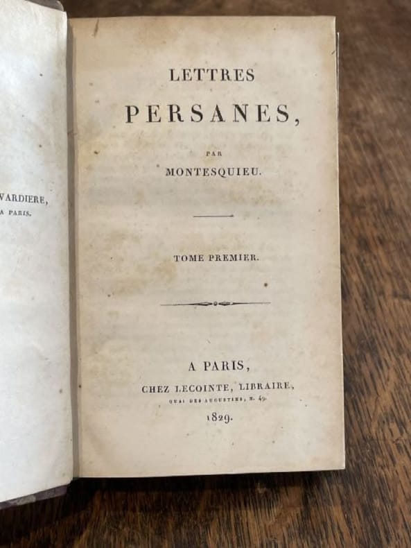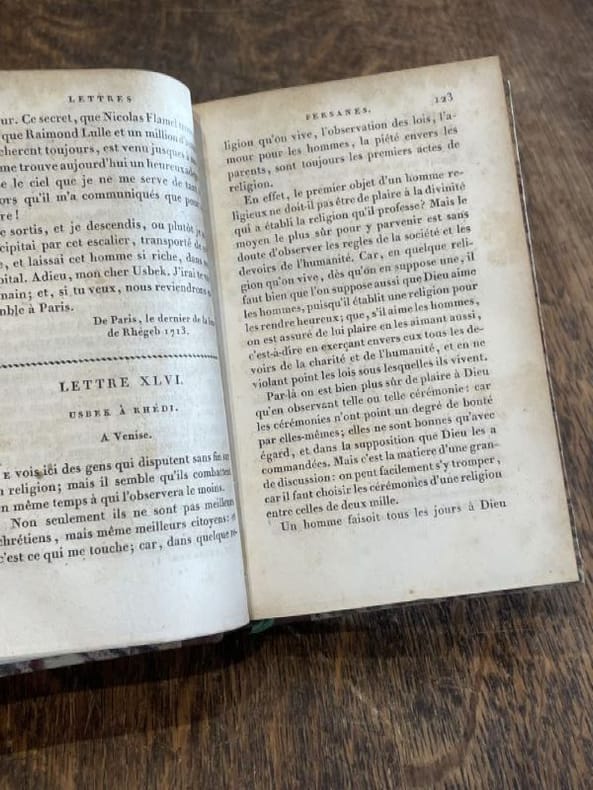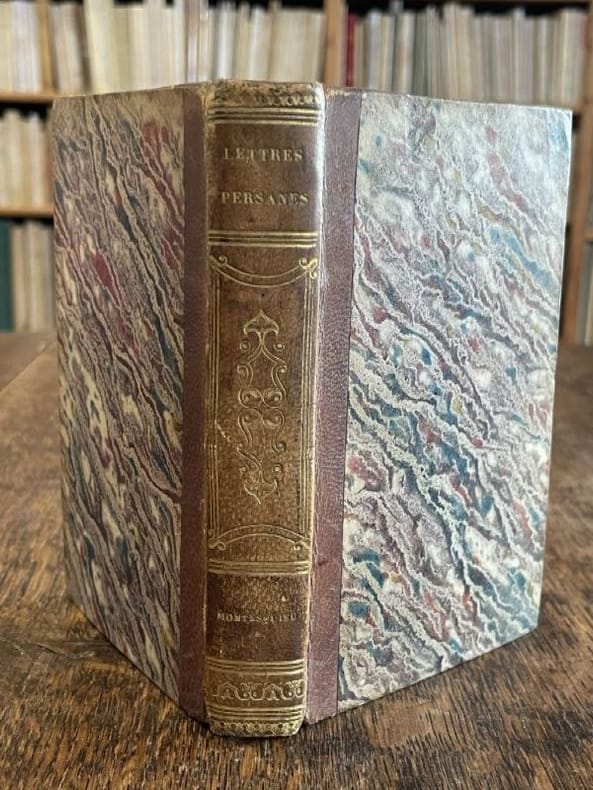 Ensemble complet de ses deux tomes ; reliés en un volume. Les Lettres persanes sont ici suivies - avec page de titre et pagination particulières - des Lettres turques de Saint-Foix. ''Edition augmentée d'un Supplément aux Lettres persanes et des Lettres turques de Saint-Foix''. (in Vian). Usbek, un philosophe persan, accompagné de son ami Rica, fait un voyage en Europe jusqu'à Paris. En tenant à jour une correspondance avec des amis rencontrés dans les pays traversés, il dépeint d'un œil faussement naïf – celui qu'une civilisation lointaine pourrait porter sur l'Occident, réduit dès lors lui-même à quelques contrées exotiques – les mœurs, les conditions et la vie de la société française du xviiiesiècle. Le «regard étranger», dont Montesquieu donne ici un des premiers exemples éloquents, contribue ainsi à alimenter ce relativisme culturel qu'on devait voir ensuite illustré chez d'autres auteurs du xviiiesiècle. Mais ce roman épistolaire vaut aussi en lui-même, en outre par sa peinture des contradictions déchirant le personnage central d'Usbek: partagé entre ses idées modernistes et sa foi musulmane. Si on lit entre les lignes, Montesquieu critique ici clairement de façon implicite le système monarchique sous lequel il vit. Cette «arme fatale» (créée par Richelieu) consiste à réunir les 3 pouvoirs (législatif, judiciaire et exécutif) sur la tête d'une seule et même personne: le Roi. En résumé, dans ce texte, Montesquieu laisse entendre la vulnérabilité et la versatilité des Français face à leur souverain. Vian, Bibliographie des Oeuvres de Montesquieu, p. 3. Angles et coupes élimés. Pièce de titre absente. Irisation et infime perforation en marge des feuillets liminaires. Présence de quelques cernes, rousseurs et tâches claires dans le corps d'ouvrage. L'ensemble demeure en bonne condition.