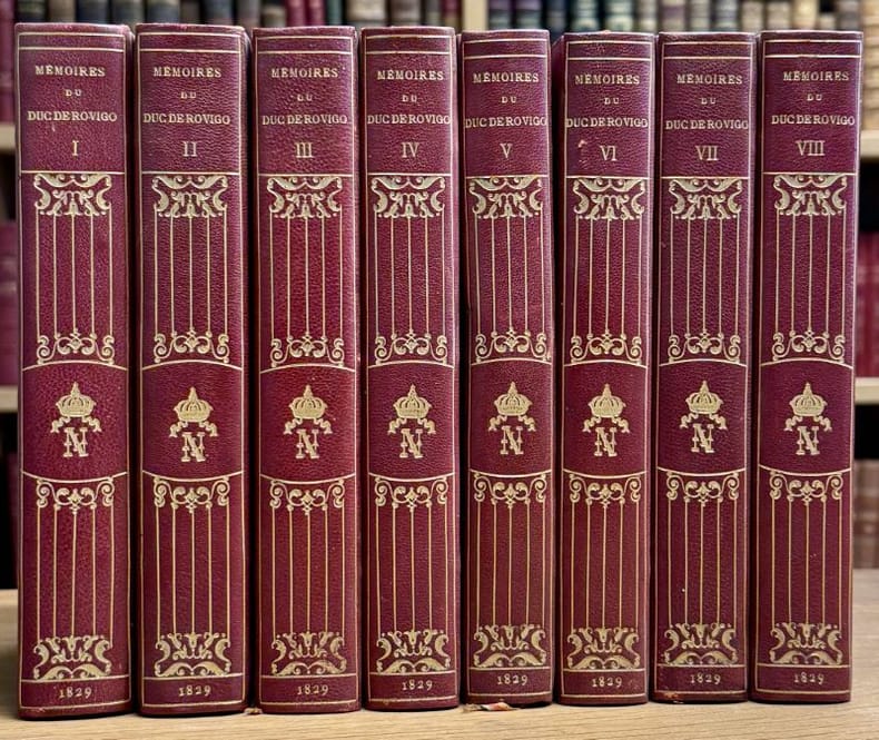 Garnier Frères 12 x 18 Paris 1900 Cinq volumes petits in-8, 1900-1901, reliure demi-veau vert sombre de l'époque, dos lisse orné de doubles filets dorés, de quatre lauriers et de l'aigle impérial, titre et tomaison dorés, VII-X-563, 452-[8], 475-[9], 464-[10], 462-[6] pp. Edition nouvelle, refondue et annotée par Désiré Lacroix, ancien attaché à la Commission de la Correspondance de Napoléon 1er. Elle reprend le texte de la seconde édition de 1829, qui avait été enrichie par rapport à la première de 1828 de "notes explicatives pour répondre au déchainement de lettres, de protestations, de brochures, de pamphlets émanant de ceux que le duc de Rovigo avait mécontentés ou mal appréciés dans leurs actes". Familier de Napoléon, le général Savary (Marcq, 1774 - Paris, 1833) s'est trouvé mêlé à tous les événements du Consulat et de l'Empire. Après Tilsitt, à son retour de Saint Pétersbourg, où il négociait le rapprochement entre la Russie et la Turquie et l'abandon de l'alliance anglaise, il est créé duc de Rovigo le 7 février 1808, avec une dotation de 15000 frs sur le domaine d'Ottendorf, situé en Hanovre. Agréable reliure, bon exemplaire.(B57). Ex-libris gravé de Marcel Blazy. PHOTOS NUMERIQUES DISPONIBLES PAR EMAIL SUR SIMPLE DEMANDE-DIGITAL PHOTOGRAPS MAY BE AVAILABLE ON REQUEST