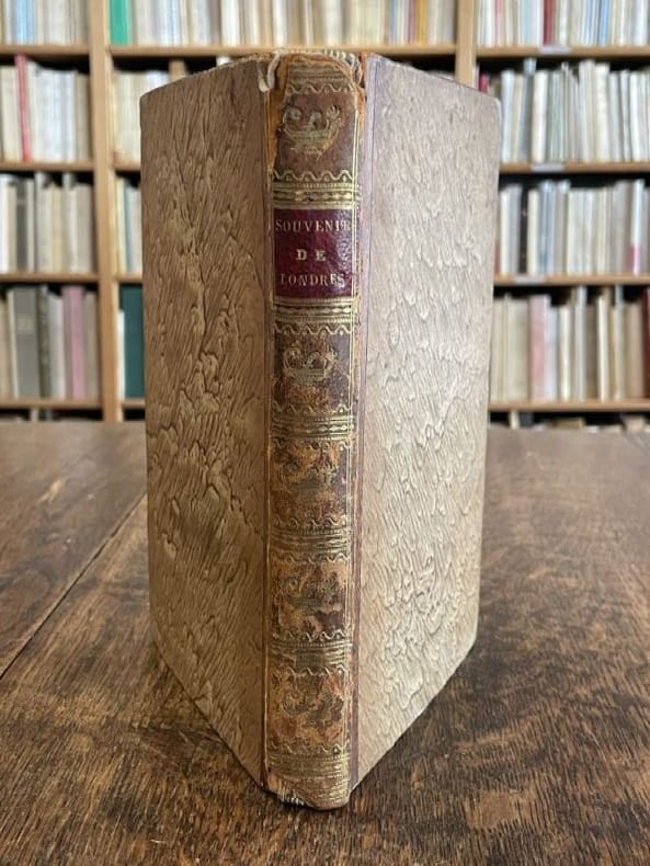 Paris De l'imprimerie de Crapelet 1817 1 vol. relié in-8, demi-basane fauve, dos lisse avec pièce de titre de cuir rouge, plats de papier marbré brun, tranches mouchetées rouges, VI + 277 pp. Edition originale de cette plaisante évocation de la capitale anglaise sous forme épistolaire. Mors et coiffes usés avec petits manques de cuir, sinon bon exemplaire en reliure d'époque complet de ses 12 planches gravées hors-texte et du plan replié en fin d'ouvrage.