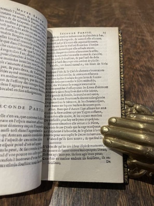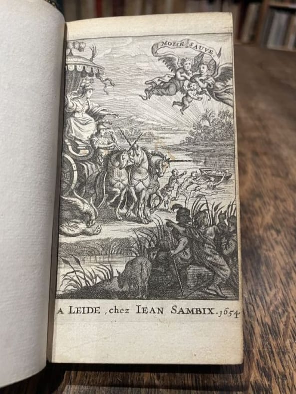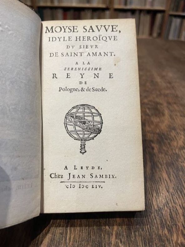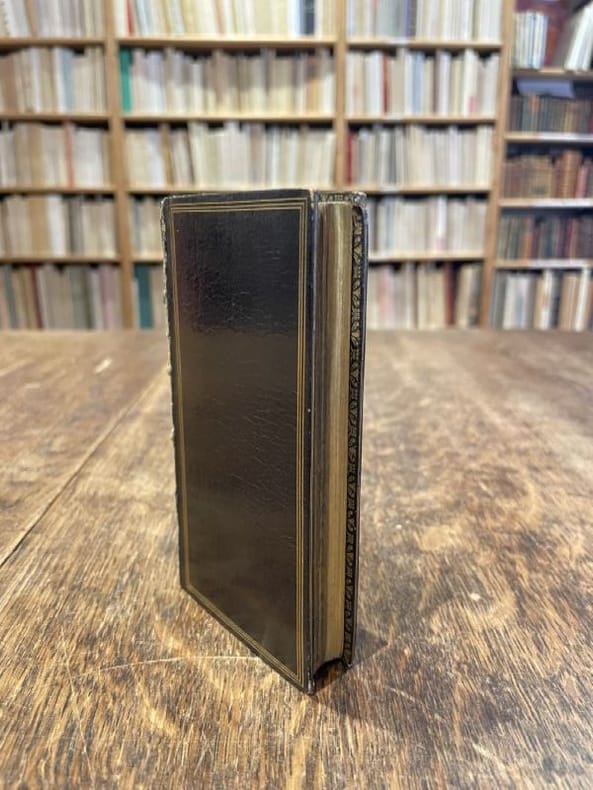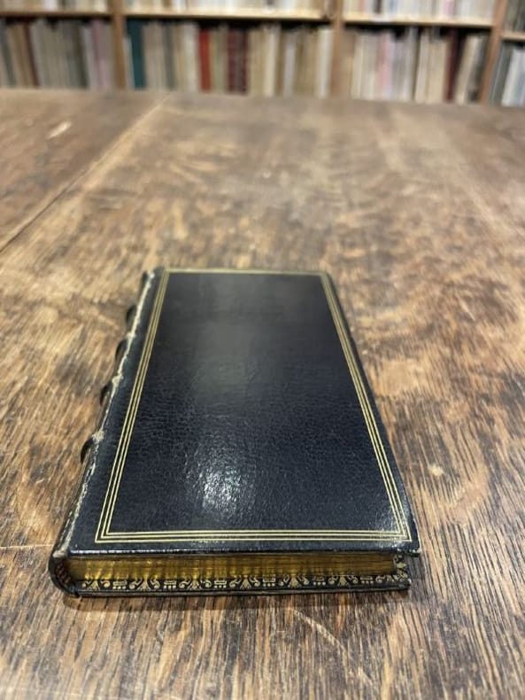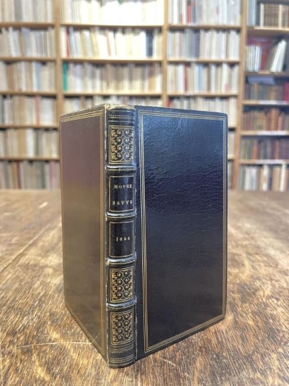 Leyde Jean Sambix 1654 1 vol. Relié petit in-12, maroquin noir, dos à nerfs orné de caissons dorés à la grotesque, triple encadrement doré sur les plats, coupes filetées et dentelle intérieure, tranches dorées (Simier, R. du Roi), 18 ff. + 188 pp. Jolie édition ornée d'un frontispice gravé (un peu court de marge) paru un an après l'originale. Ce poème sur la sortie d'Egypte du peuple hébreu auquel Saint Amant travaillait depuis plusieurs années est dédié à sa protectrice, la reine de Pologne et de Suède. Il s'agit de la véritable édition elzévirienne avec le titre en 9 lignes (au lieu de 7 dans la contrefaçon). Il manque les feuillets de table des matières. Jolie reliure signée du début du XIXe siècle, avec d'infimes marques aux mors, coiffes et coins. Ex-libris gravé de l'avocat et homme d'Etat belge Sylvain van de Weyer (1802-1874).
