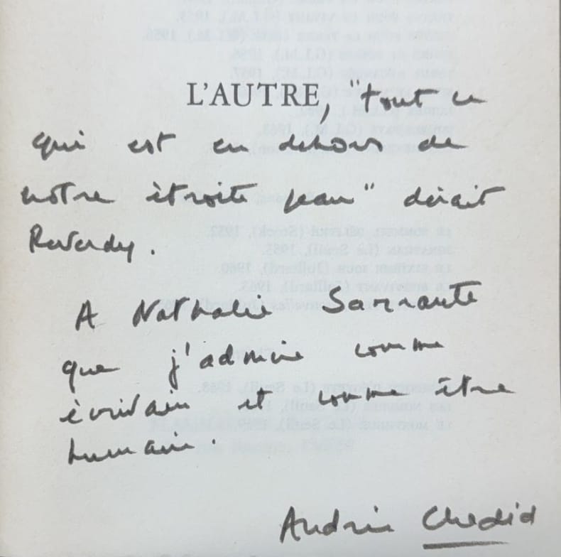 Paris Flammarion 1969 1 vol. broché in-8, broché, 169 pp. Édition originale. On y retrouve le thème du sauvetage, comme dans Le Sixième jour, cette fois entre un vieil homme qui tente d'aider un jeune étranger pris sous un séisme. Exemplaire enrichi d'un bel envoi autographe signé de l'autrice : "L'Autre, "tout ce qui est en dehors de notre étroite peau" disait Reverdy. A Nathalie Sarraute que j'admire comme écrivain et comme être humain". Complet du bandeau d'éditeur : "Le vieil homme et la terre".