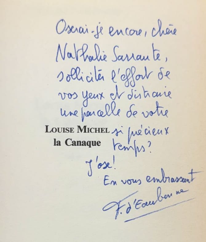 Paris Encre 1985 1 vol. broché in-8, broché, couverture illustrée, 238 pp. Édition originale avec un bel envoi autographe signé de la femme de lettres à Nathalie Sarraute : "Oserais-je encore, chère Nathalie Sarraute, solliciter l'effort de vos yeux et distraire une parcelle de votre si précieux temps ? J'ose ! En vous embrassant".